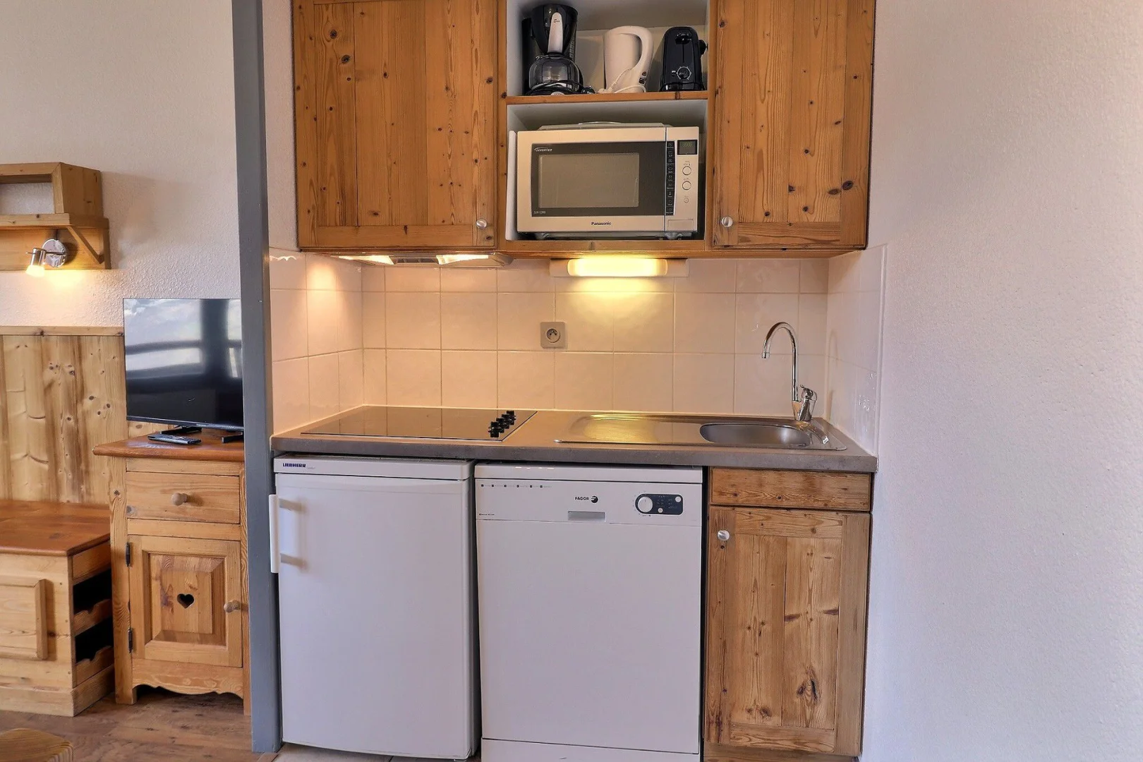 Кухня: микроволновая печь/духовка, холодильник, 4 стеклокерамические конфорки, посудомоечная машина, капельная кофеварка, вытяжка