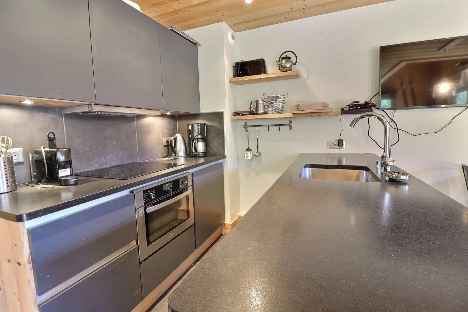 Открытая кухня: духовка ,маленький холодильник, посудомоечная машина, 4 стеклокерамические конфорки, вытяжка, кофеварка Nespresso, капельная кофеварка, чайник, тостер.