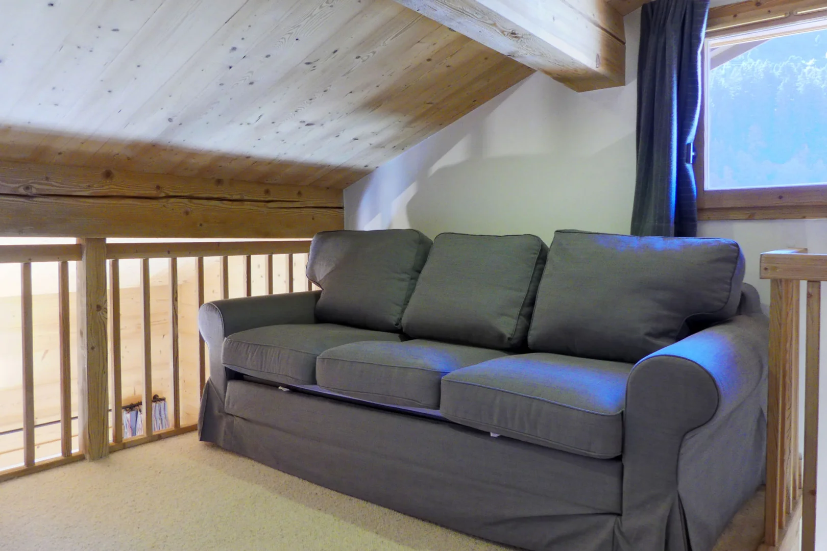 Мезонин открыт на гостиную: раскладной диван 2 чел
